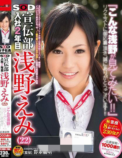 日本AV女优浅野惠美参演的作品番号SDMT-929,该片(SOD宣伝部 入社2年目 浅野えみ(22) 『こんな浅野が見てみたい!!』リクエストに御応募頂き、誠にありがとうございます!!応募総数1000通!!から厳選したリクエストに業務中に応えさせましたっ!!)时长 245分钟,本番号作品分类定义于:企画、OL、正式发片日期是 2013月05月09日。